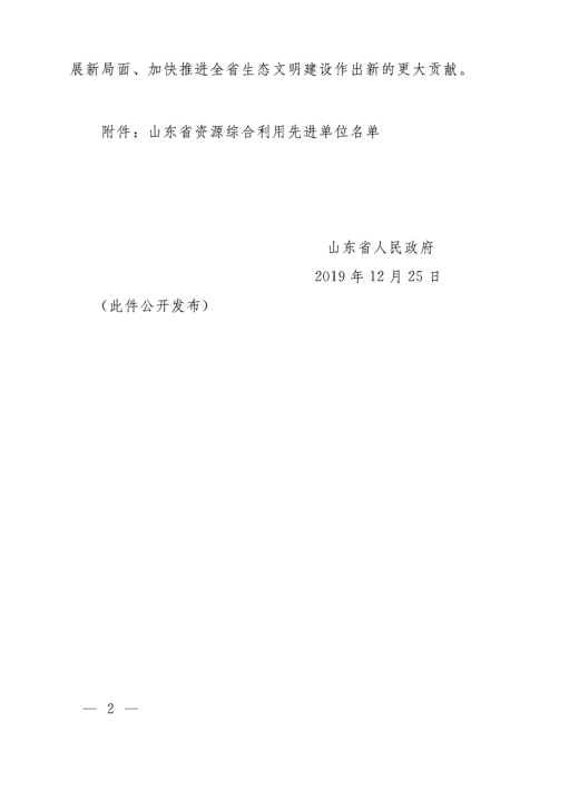 2019年12月25日,山東省人民政府發布關于表彰山東省資源綜合利用先進單位的通報